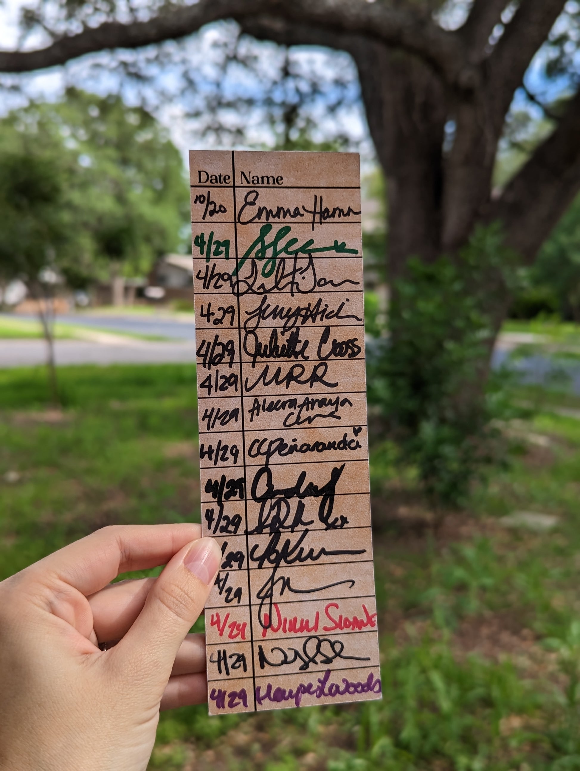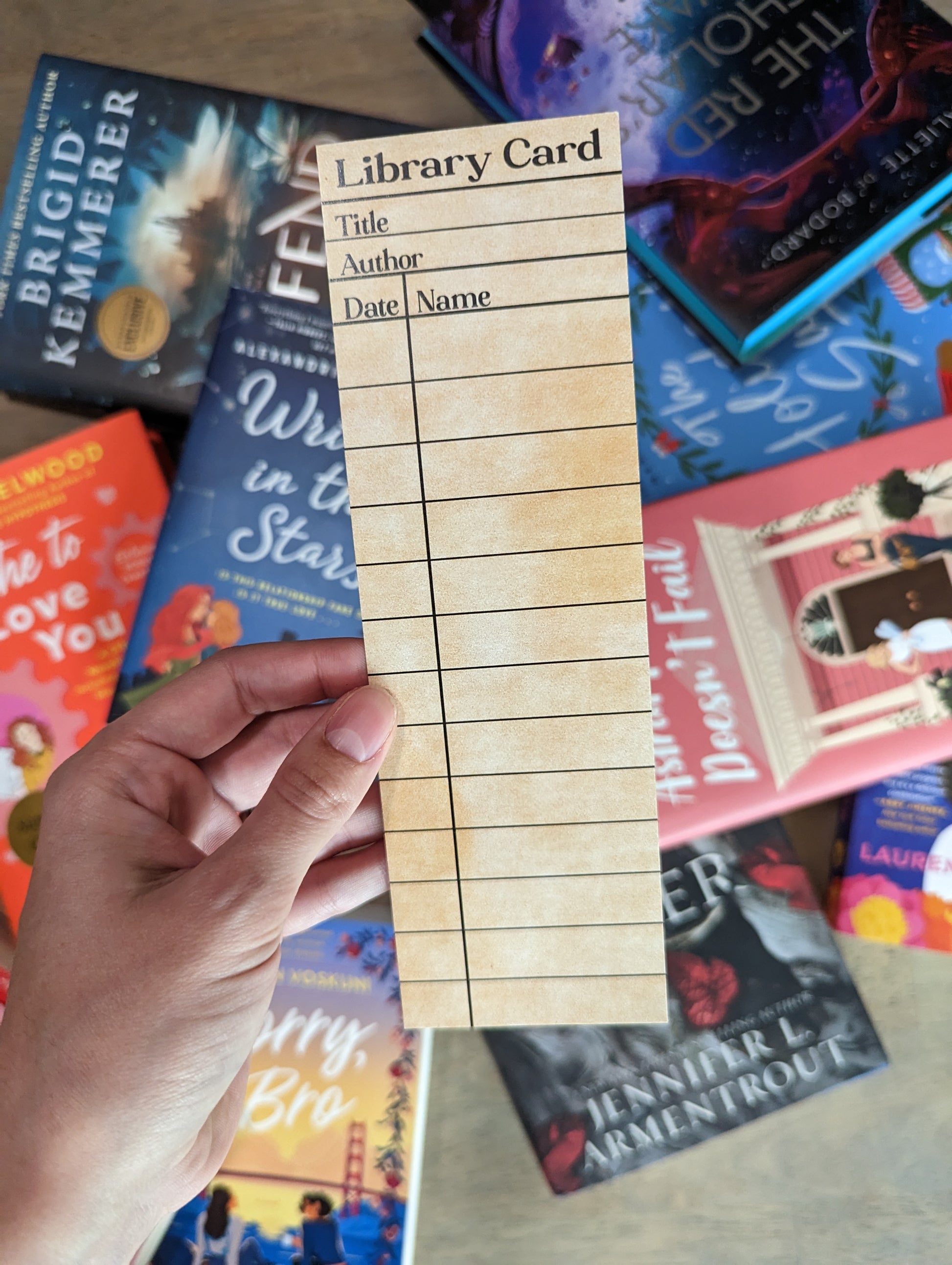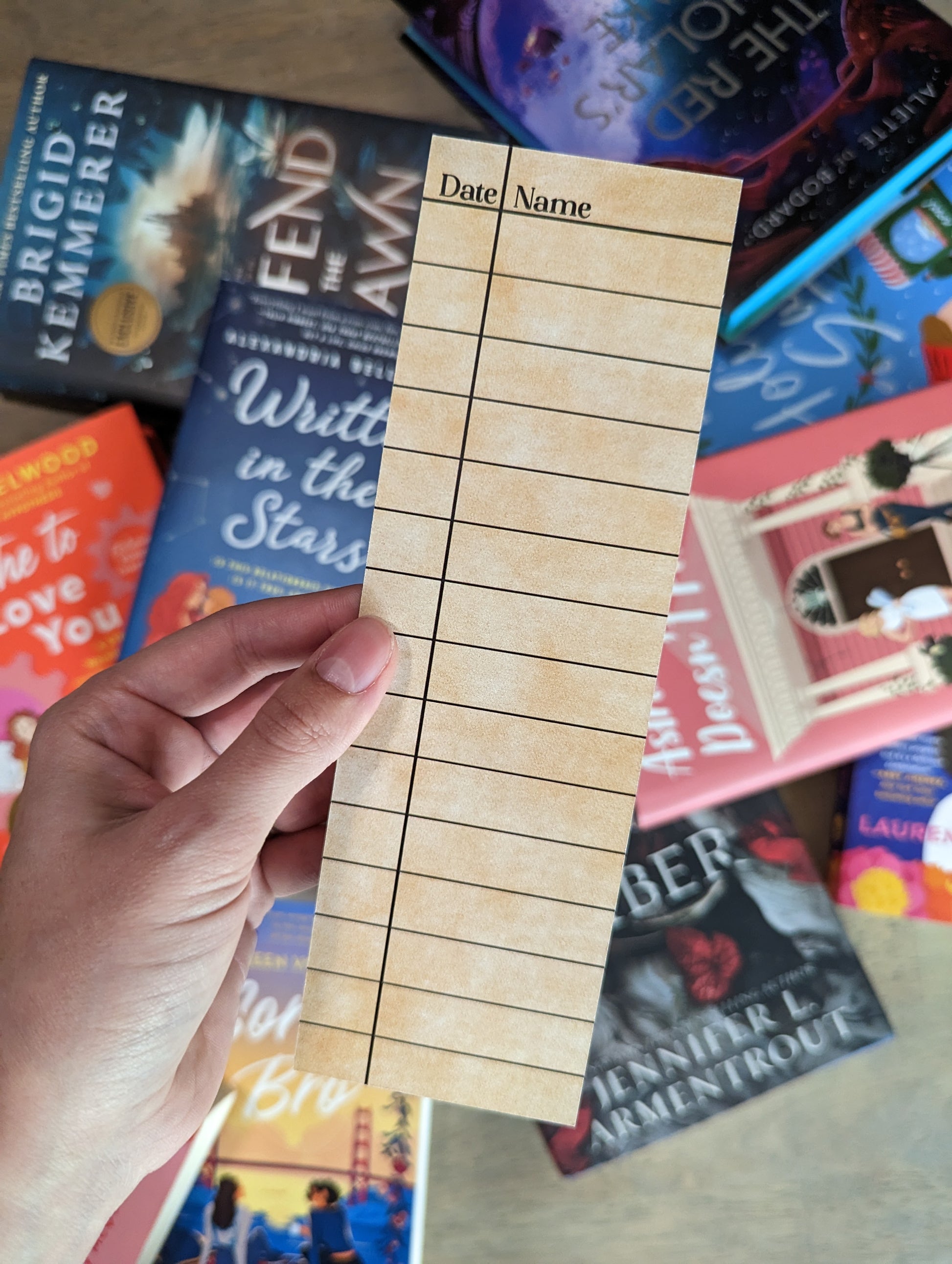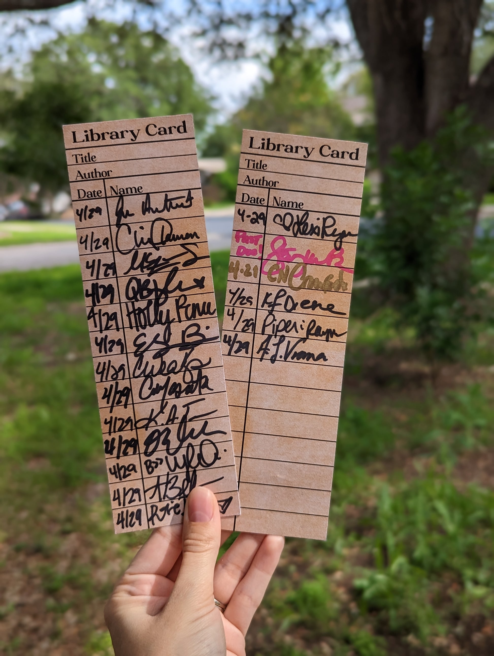 2.5x8" printed on 18pt cardstock. Library Card design is perfect for 28 Author signatures at singings or a fun way to track your reads or favorite characters!