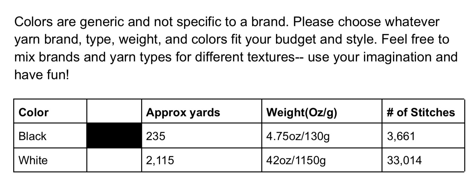 - Yarn in appropriate colors and yardage (worsted weight #4)
