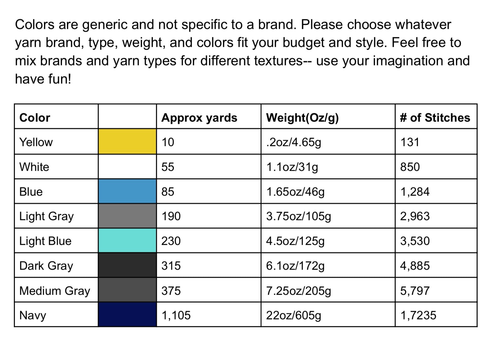 - Yarn in appropriate colors and yardage (worsted weight #4)