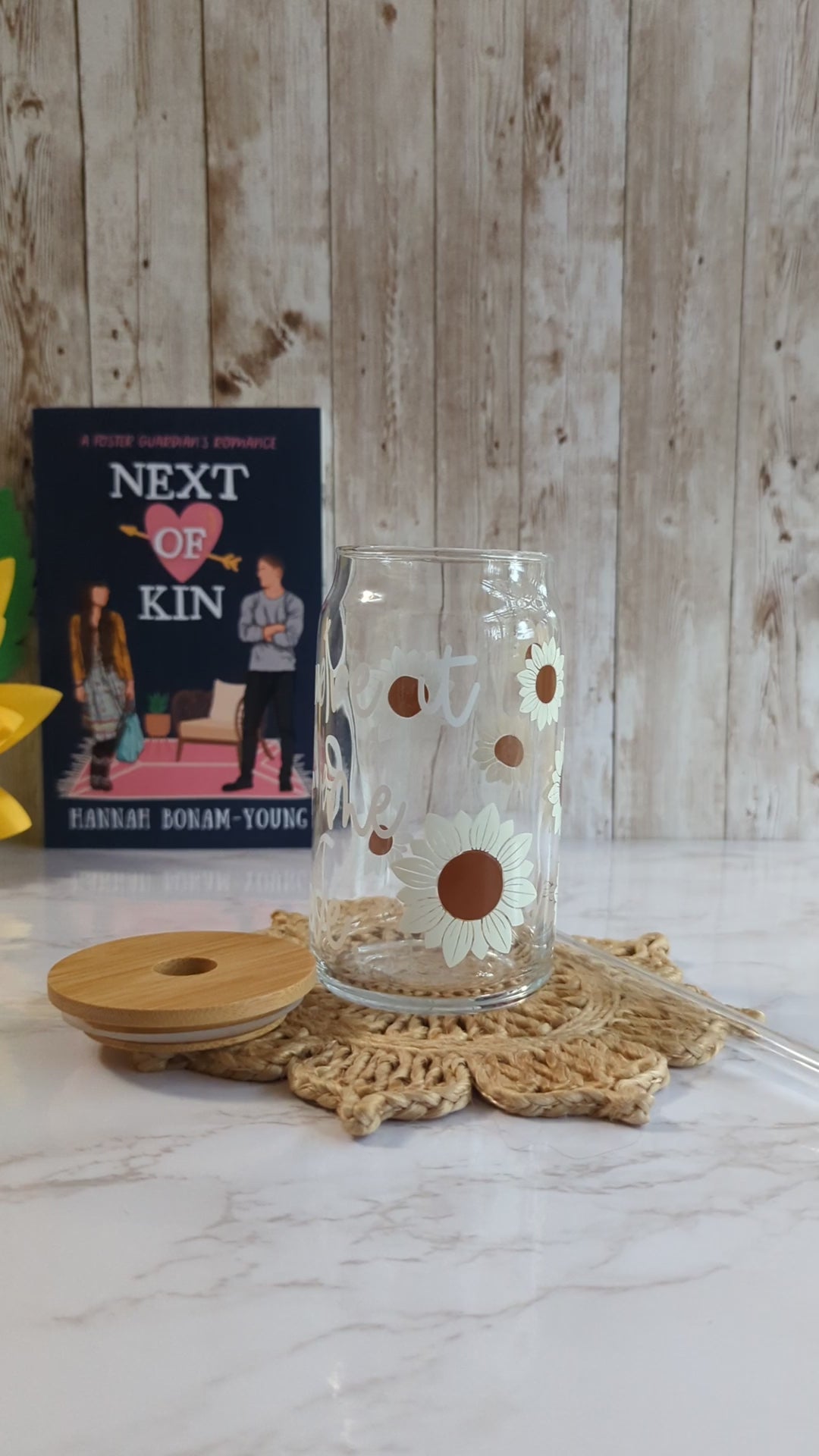 16oz beer can glass style tumbler with bamboo lid and glass straw. Perfect for water, iced coffee or smoothies!