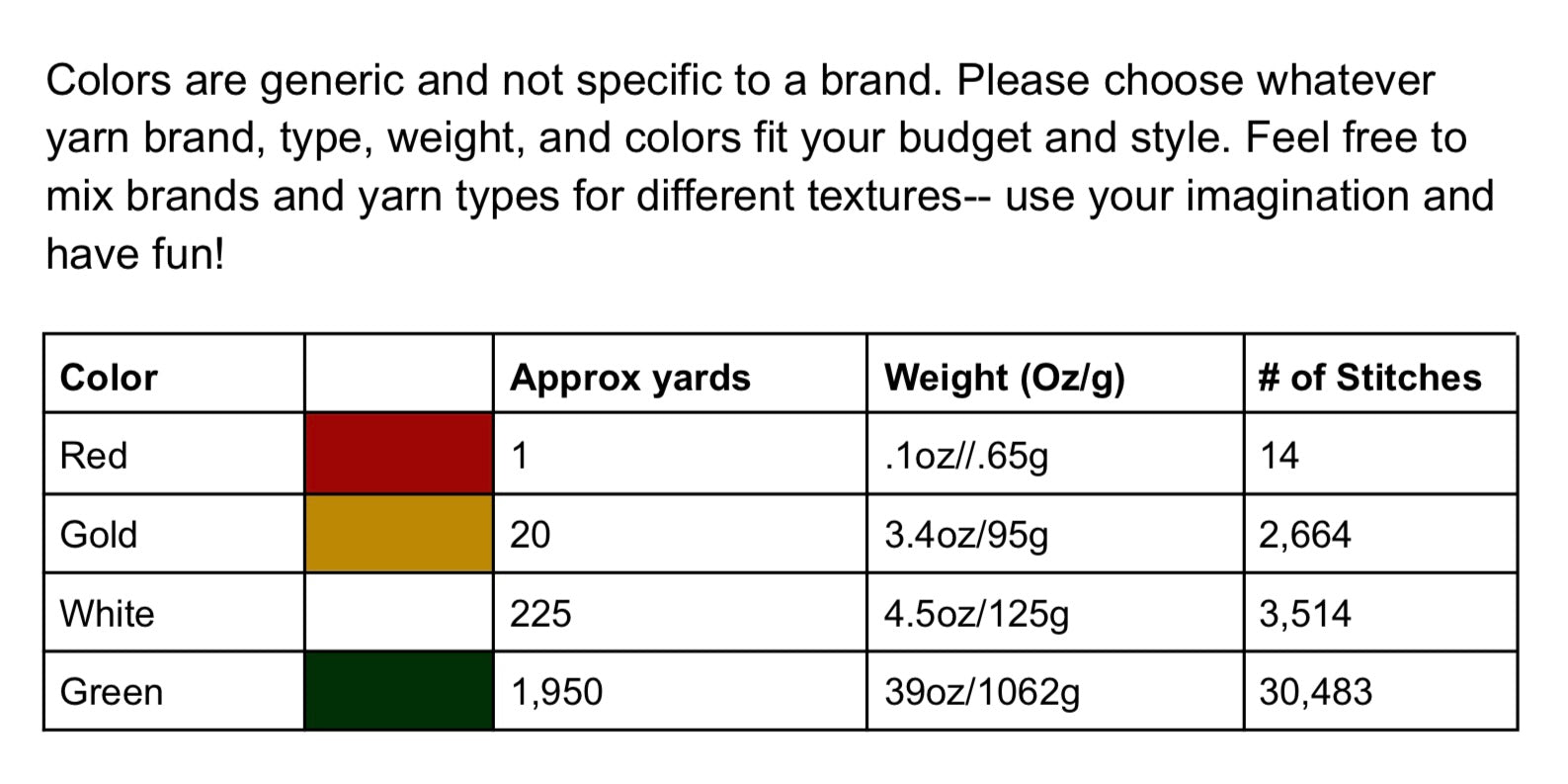 - Yarn in appropriate colors and yardage (worsted weight #4)