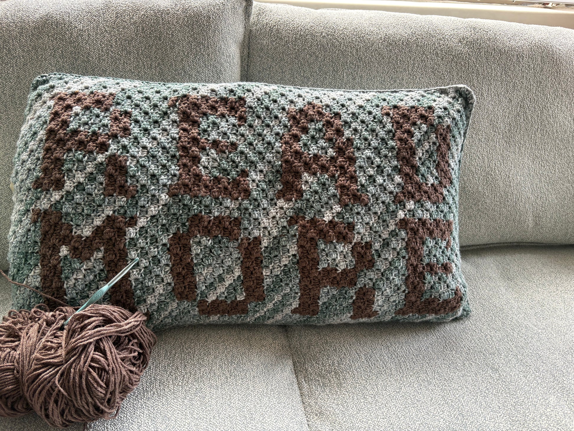 The finished size of the pillow or wall hanging will vary depending on the hook size, yarn, tension and the amount of stuffing used.