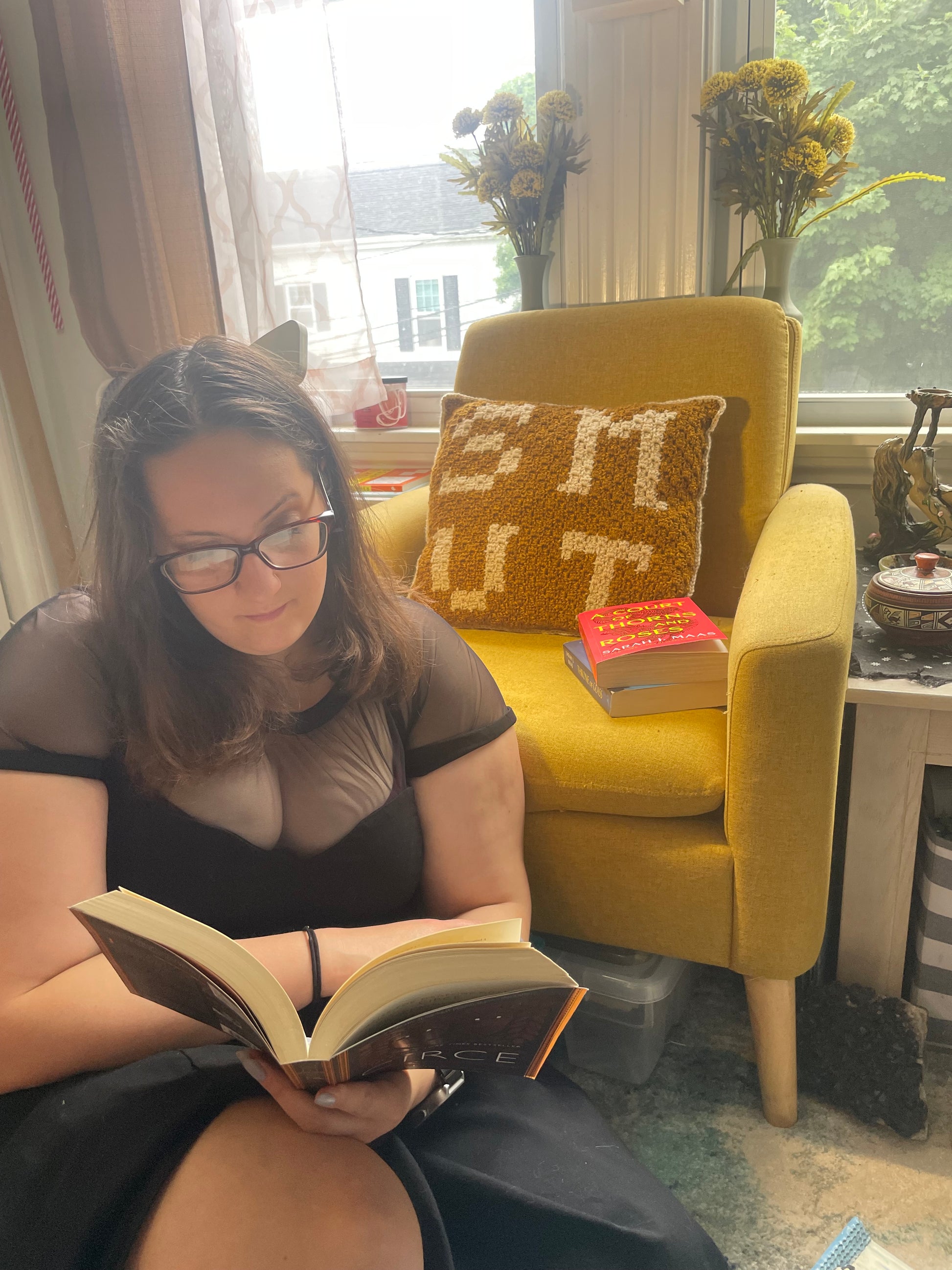 Crochet the perfect cuddly reading companion that will support your book or reading device! Stylish enough to make a cute couch or chair decoration when not in use.