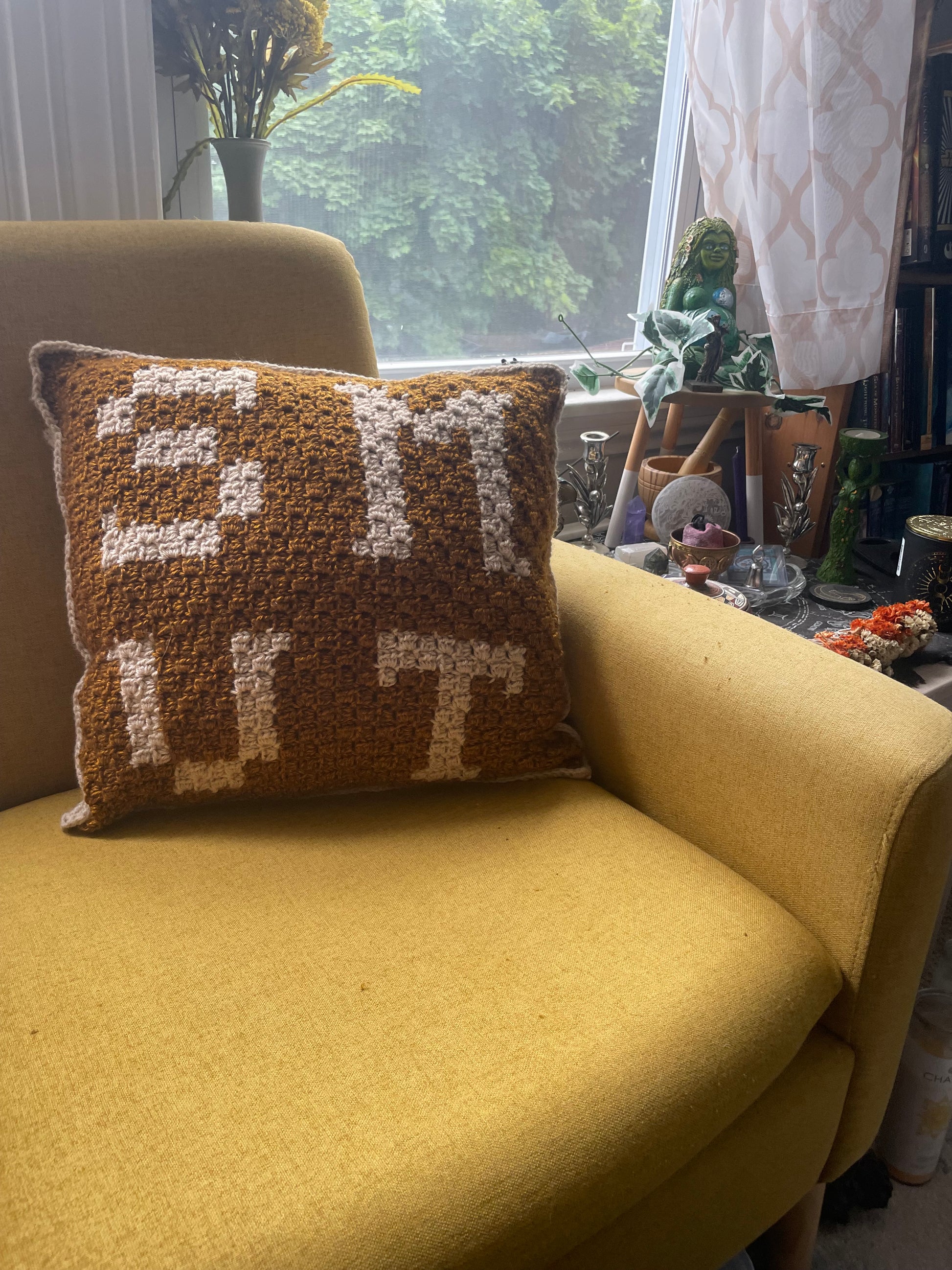 The finished size of the pillow or wall hanging will vary depending on the hook size, yarn, tension and the amount of stuffing used.